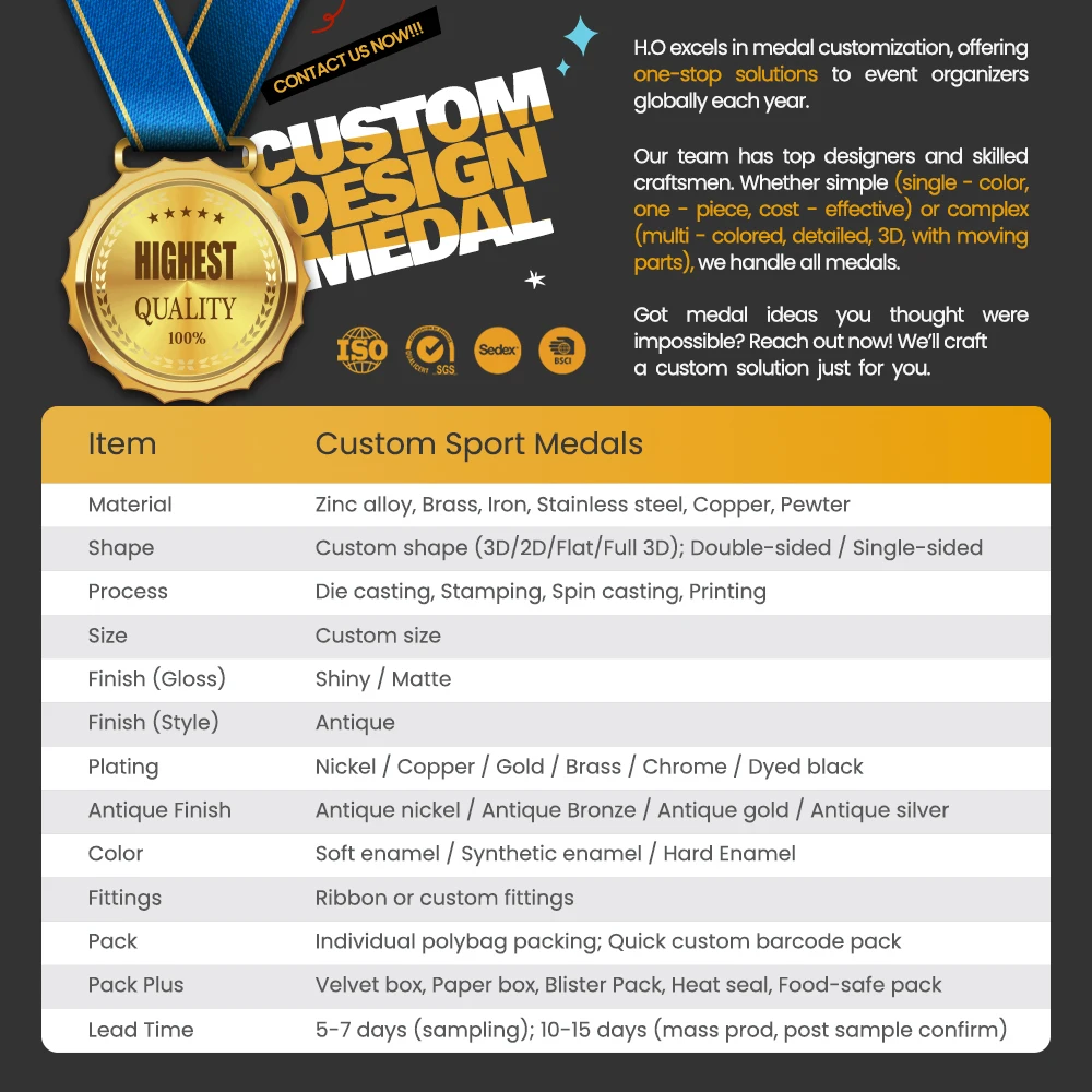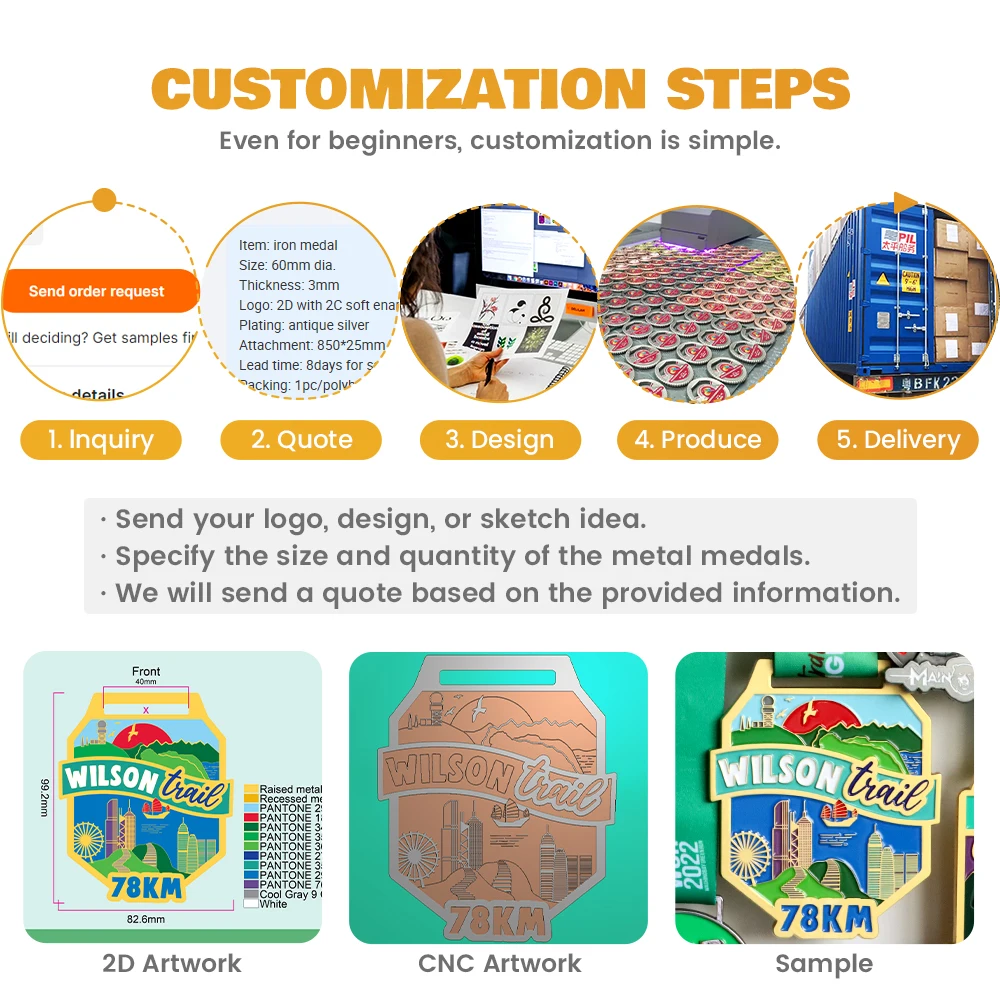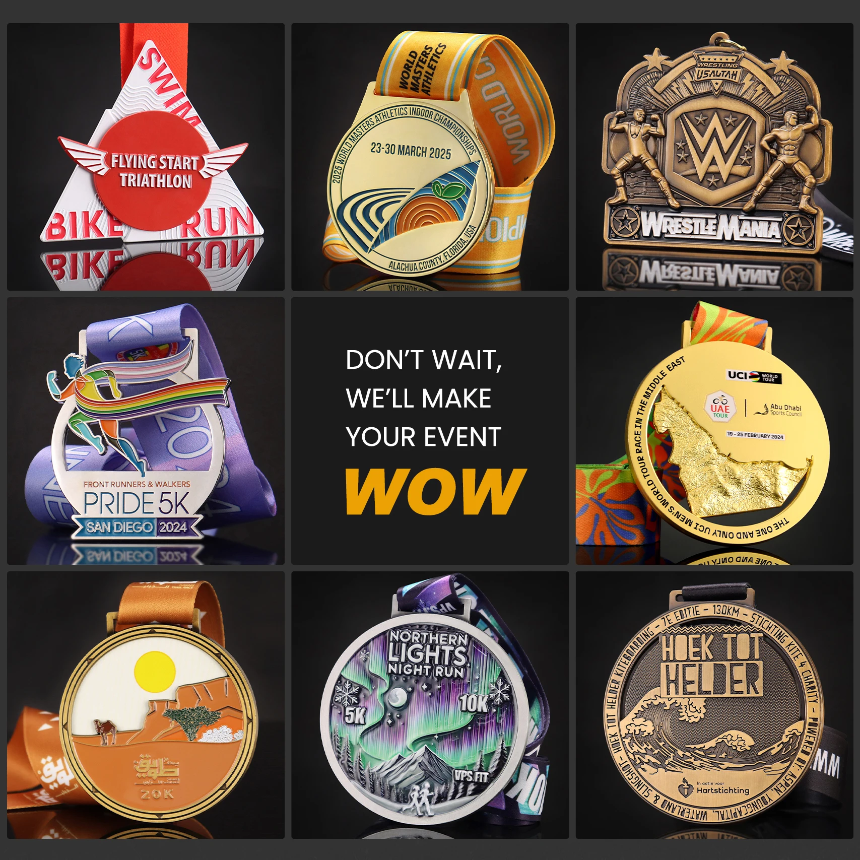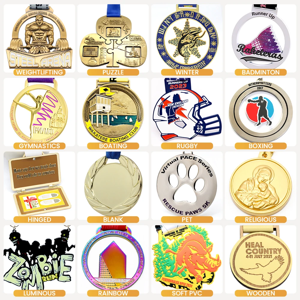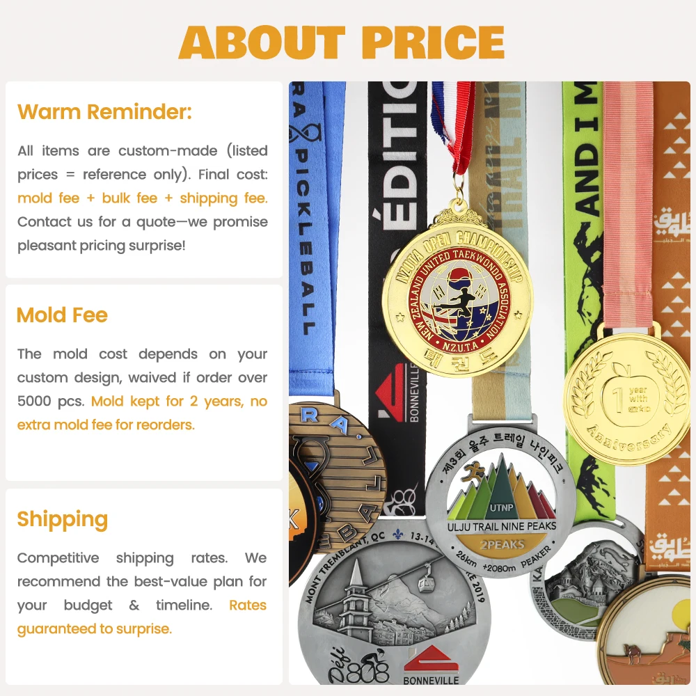 The minimum order quantity varies depending on the design and complexity of the medal. Typically, our minimum order starts at 100 pieces. Please contact us for more detailed information based on your specific requirements.